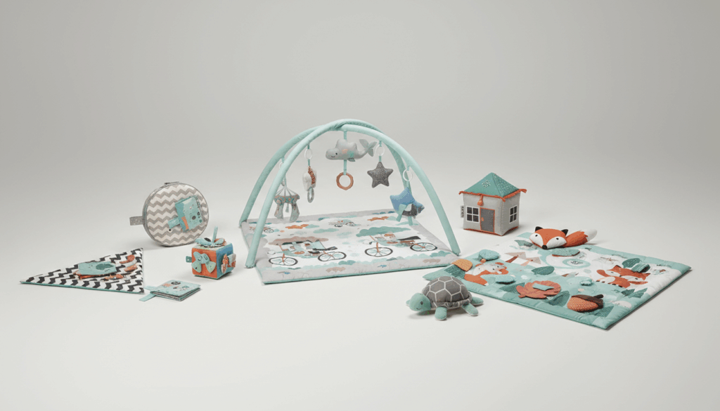 Aktivitetstæpper er bløde, sikre legeområder til de små. Mange tæppe modeller har to buer eller en ramme med farver, teksturer og sanseelementer som rangler og knitrelyde. De giver også mulighed for fastgørelse af en bidering eller små legetøj, så barnet kan gribe og opdage i liggende eller mave-tid. Variationer spænder fra store tæpper med rammer til kompakte rejsetæpper og trekantede versioner til hjemmebrug eller i barnevognen.